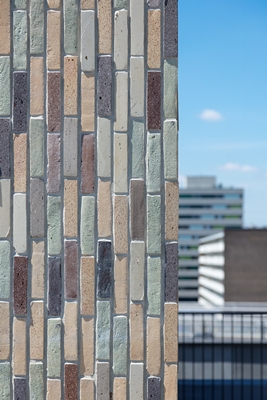 Voor de gevel is er gekozen voor een nauwkeurig samengesteld kleurenpalet van steenstrips van Stone Cycling. Deze steenstrips zijn gemaakt van bestaand afval. Bouw- en sloopafval is de grootste afvalstroom in Nederland, 30 % van al het afval dat we produceren in Nederland. Voor ons en de opdrachtgever was het erg belangrijk om een duurzaam materiaal te gebruiken. Wij waren al vroeg bekend met Stone Cycling en we delen hun droom om samen te proberen de hoeveelheid afval die momenteel aanwezig is te minimaliseren. We zijn daarmee in een spannend proces gestapt waarbij we samen met de opdrachtgevers en de producent een specifiek en uniek gevelbeeld kunnen creëren, maar waarbij het uiteindelijke resultaat nog onzeker was omdat sommige stenen voor het eerst in productie zouden komen. Door de goede en intensieve samenwerking in de ontwerp- maar ook realistatiefase heeft het geresulteerd in een zeer uniek en bijzonder eindresultaat. Alle gebruikte stenen hebben verschillende afvalstromen in zich die het uiterlijk van de steen bepalen. Zo bestaat de groene iets wat glanzende strip o.a uit afval van groen glas. Deze steen is door het smelten van het glas in de oven, ook de strip die licht glanst.