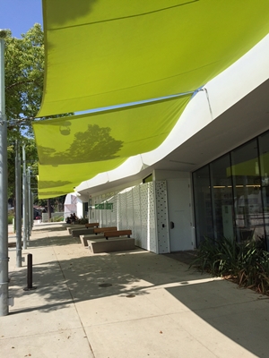 Voor de luifels is de gekozen voor de Soltis Perform 92 zonweringdoeken van Serge Ferrari, in een anijskleur. Ze zijn geïnstalleerd op de voorgevel van het gebouw. De limoengroene kleur van deze luifels geeft het gebouw een moderne touch en maakt de Pico Branch Library eenvoudig te herkennen.