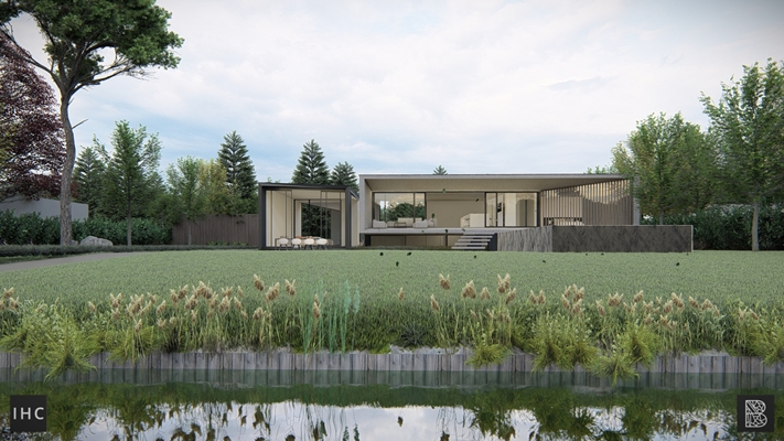 eetkamer, zwembad, overdekt terras, luxe master, 3 gasten slaapkamers, kantoor, bioscoop en een overdekte garage. De abstracte minimalistische sferen worden benadrukt door de natuurlijke materialen die in de woning verwerkt zijn. Hierdoor vormt de woning een perfect geheel met de omliggende natuur en waterkant.
