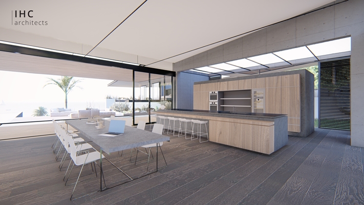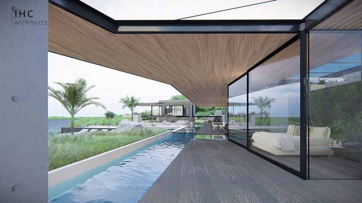 Binnen dit ontwerp van IHC Architects is water de verbindende factor. Het is terug te vinden in de glazen vloerdelen waar het water doorheen loopt, het zwembad met glazen eindwand en de glazen daken met een laagje water waardoor een lichtspel ontstaat in de woonruimtes.