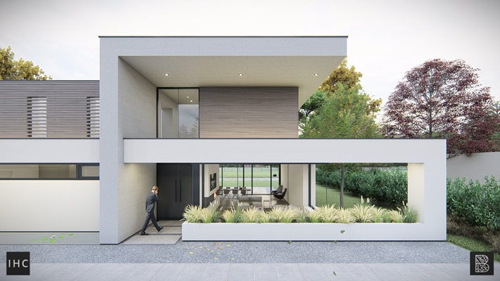 De voorgevel van deze moderne woning is zodanig gesitueerd dat de woonkamer met een naadloos hoekraam verbinding maakt naar de enige connectie met de straat. Het lijnenspel pas zicht hierop aan door een speelse doorkijk te maken naar het water met een geïntegreerde plantenbak.