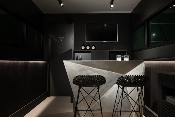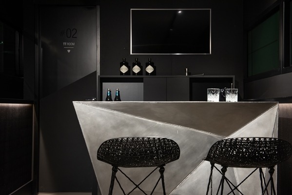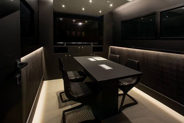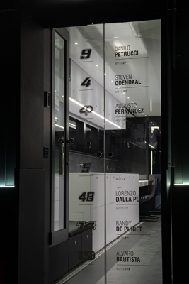 Hiernaast bevindt zich op dezelfde vloer een tweede lounge met cocktailbar en afgesloten mini boardroom voorzien van het laatste op het gebied van media en communicatie. REV’IT’s rijke race-historie mag niet ontbreken en is duidelijk zichtbaar middels diverse items zoals origineel gesigneerde racehandschoenen van (voormalig) REV’IT!-rijders Randy de Piniet en voormalig wereldkampioen uit 2015 Kenan Sofuoglu. Kussens gemaakt van oude racepakken sieren de lounge bank. Van buiten tot binnen maakten wij dit nieuwe Race Technology Center tor één grote sensationele REV’IT! merkbeleving. Van de mat-zwarte stalen koelribben en verzonken doorlopende zwarte ramen aan de buitenkant, tot het zwart-wit mat en hoogglans, metallic en high-tech interieur met aluminium futuristische bar en side tables en lounge bank voorzien van hightech stoffering. Welkom bij REV’IT!”s Racing Technology Center op de MotoGP!