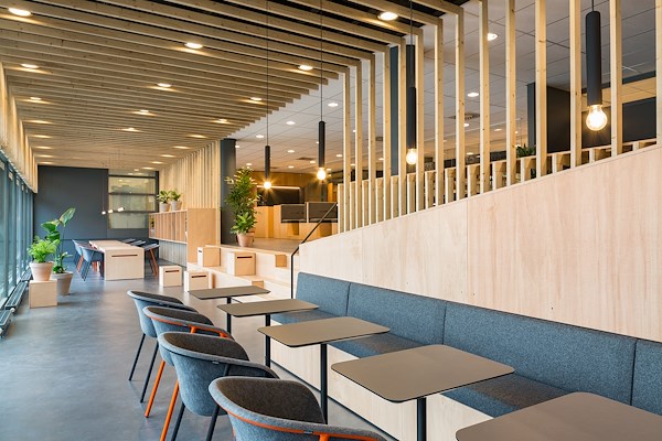 het nieuwe interieur van Stadsdeelkantoor Buikslotermeerplein. Het betreft een circulair ontwerp voor 1200m2 superflexkantoor en een nieuw restaurant dat in het najaar wordt opgeleverd.
