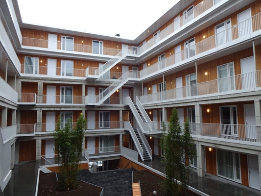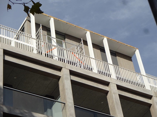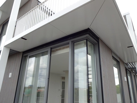 De dakranden van de bovengelegen houtskeletbouwwoningen zijn afgewerkt met aluminium muurafdekkappen en de ramen van het gebouw zijn voorzien van aluminium waterslagen. De plafondplaten onder de overstekken van de bovenste woonlagen zijn eveneens van aluminium. Daarnaast zijn de kolommen op deze woonlagen zijn met aluminium zijn bekleed. De witte aluminium accenten combineren prima met de grijze betonkleur. Ook het nutstracé dat onder de galerijplafonds loopt, is omkleed met een eenvoudig toegankelijke aluminium koof.