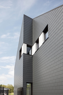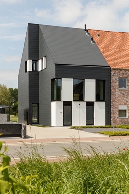 Dit project is een geslaagd voorbeeld van de veelzijdigheid van leien in combinatie met andere bouwmaterialen. Kijk ook eens naar de speelse afwisseling van de grote raampartijen en de witte gevelvlakken.