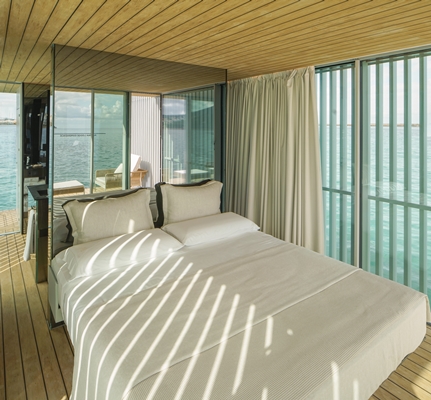 Deze locatie biedt plaats voor twee personen, die van water houden, willen ontspannen en de natuur respecteren. De gasten kunnen de omgeving met alle zintuigen beleven, terwijl het drijvende paviljoen gelijktijdig privacy, comfort en welzijn garandeert.