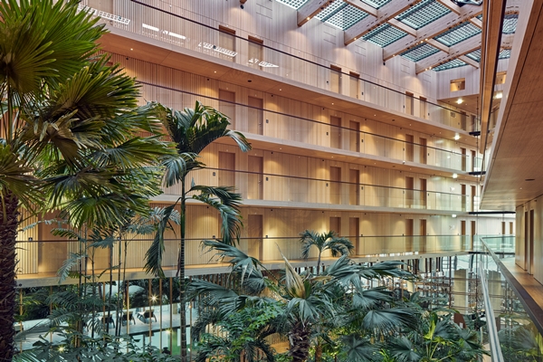 De planten staan in de volle grond en een ingenieus klimaatsysteem zorgt dat temperatuur en vochtigheid niet alleen goed zijn voor de planten maar ook prettig voor de bezoekers. Heel belangrijk in de duurzaamheid is de keuze voor houtbouw, en daarmee de terugkeer van een oude manier van bouwen. ‘De complete dertig meter hoge draagconstructie is gebouwd in hout, een primeur in Nederland. Alleen de vloeren, liftschachten en trappenhuizen zijn uitgevoerd in beton.’ In de glazen met staal versterkte gevels en het dak van het atrium zijn zonnepanelen verwerkt, een van de redenen waarom het pand volledig energieneutraal is. De kamers zijn als prefab houten modules gemaakt, geleverd en ‘als lego-blokjes’ geïnstalleerd in het hotel.