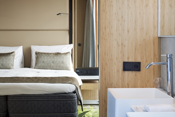 Materialen van Gira: Data en netwerk in het hotel, schakelaars, stopcontacten en usb-voeding in de hotelkamers.