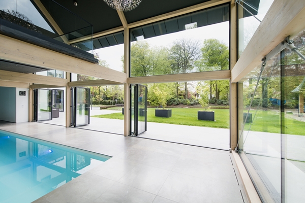 De moderniteit is terug te vinden in het comfort van de woning en eigentijdse ruimtes als een bioscoop, zwembad, wellness en spa, maar vooral in het ruimhartige gebruik van glas. Van de manshoge dakkapellen in de kruin tot de openslaande deuren op de begane grond en de grote vouwdeuren bij het zwembad: licht en zicht is het devies. De glazen deuren aan de tuinzijde werden bijvoorbeeld met opzet twee keer zo breed gemaakt. “Dit zorgt voor veel licht in de kamers en een fraai uitzicht op de tuin.” Alle ramen, taatsdeuren, stolpdeuren en vouwdeuren zijn op maat gemaakt door Metaglas. Poort viel daarbij vooral voor de slanke profilering van het product. “Dat maakt dat het geheel er heel strak uitziet. Het benadrukt het contrast tussen modern en klassiek, en juist dat contrast zorgt ervoor dat alles bij elkaar past.”