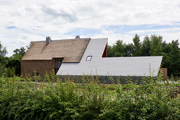 Woning EE is verfijnd gedetailleerd en zeer consequent tot in alle details: verholen goten, verdiept liggende PV panelen in het houten dakvlak, en riet als ‘deken’ van het peil op het noorden tot in het schuine dakvlak op het zuiden. De veranda op het zuiden draagt zorg voor een natuurlijke koeling in de zomer vanwege de schaduw. Het vele glas alhier zorgt voor optimaal zonnewarmte benutting in de winter.