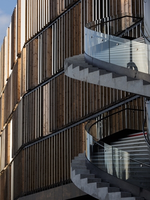 on how we reflect things and how these things appear in different lights. Perspectives and positions change continuously as they do at the newly built 12,500 m² Campus Jourdan building in Paris. Not only are the contours of the building seemingly fluid, its interior offers numerous perspectives linked via a flowing succession of diverse stairways, arcades, galleries and rooftop terraces. The façade also varies depending on its users and its surroundings. The glazed ground-floor focuses on functional and visual links between the busy road and the greenery in the rear courtyard. Vertical slats, comprising different textured materials, Quartz Grey ALUCOBOND® tray panels on one side and rough wood on the other, are positioned in front of the upper storeys. The slats can be adjusted manually to alter the view of the outside world and the amount of natural light in every room. Approximately 1,200 students, teachers and employees from two institutes of higher education keep the building in perpetual motion. This can be observed on the exterior since the angle of the slats dictates the intensity and colour of the light reflected on the façade. Areas where the façade does not move also alter: glossy surfaces in the inner courtyard, on the terraces and galleries reflect the movements, colours and lights around them. The façade and the world it mirrors are in constant flux.