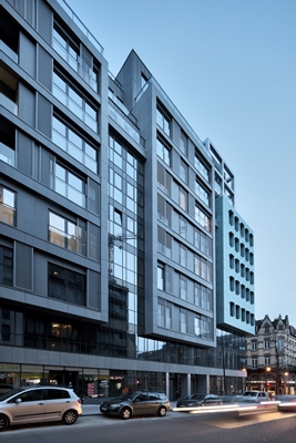 Sometimes displaying inner greatness and making yourself smaller than you really are is the whole point. For instance, if ten floors and a total floor area of 10,000 m² are supposed to fit into a mature urban environment or an old building with its decorated brick, arched windows and small towers finds itself opposite a building plot which is immense in comparison. A.D.E. architects have relied on ivision and variety to achieve the appropriate scale, both in terms of building use as well as façade design. They have replicated the surrounding urban proportions, created a ground floor retail area, stacked three floors of office accommodation on top of it, and provided flats for various target groups in the staggered levels above. The façade design is a crucial factor for the cityscape: the architects have used vertical projections and recesses, varied materials and alternated solid and transparent surfaces in order to divide up the length of the façade in the perpendicular. The result is a building subdivided into narrower structures which parallel the proportions, design diversity and window sizes in the old town: The architecture is, nonetheless, modern. Thanks to its diversity, the new volume looks less ubstantial and takes on more familiar proportions. Since time immemorial, corner buildings have been of particular importance for orientation and for the delineation of an area. The architects have taken this into account and have extended the edge of the building on the upper floors outwards a few metres, selecting Vintage Patina Copper Mat ALUCOBOND® composite panels for the cladding. This too is reminiscent of old Brussels with its towers, domes and statues weathered to turquoise-coloured metal over the years. But unlike genuine metal, these panels do not weather and become a familiar, unchanging face in the cityscape.