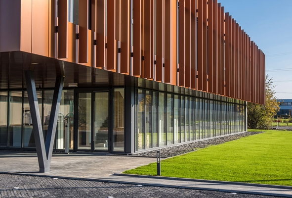 The architecture team at bsolutions has produced a carefully considered design. The compact façade envelope in ALUCOBOND® naturAL Copper is modulated by indentations, openings and projections. The conceptual use of its supporting structure ingeniously presents a multi-faceted image of this unconventional volume. A flexible interior layout has been facilitated by the façade design and the resulting lighting concept. Bsolutions won the bronze medal in the Tertiary or Commercial Building category at the first BIM awards in Belgium. BDO’s new company building, located at the entrance to Créalys Science Park, is in perfect keeping with its surroundings due to skilful positioning of the parking facilities and landscaping. Located on the office building’s west side, the entrance allows daylight to flood into the reception area throughout the day. The exterior of the building only comes into view in stages, creating an almost kinetic effect. It is this nuanced external appearance which ensures that the structure does not confront its environment; quite the contrary, its integration in the setting is both engaging and interesting.