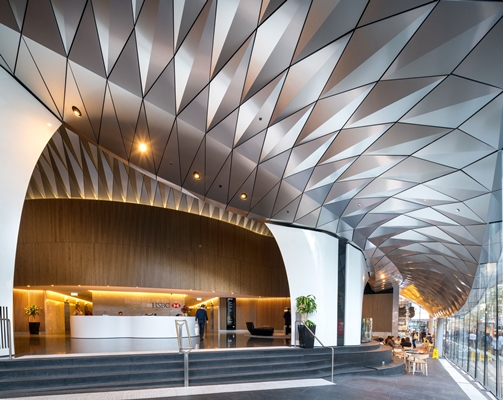 sculptural artwork and architectural elements of colonnade, awning and façade are blurred to create a new dynamic identity.The distinction between street and lobby is unfocused and connected through the folding diamond surfaces. These gently curving planes reflect both natural daylight and warm integrated lighting; each diamond of ALUCOBOND® naturAL Brushed, unique in its profile and dimensions, creates an ever-changing tone to the interior of the lobby and exterior public domain.