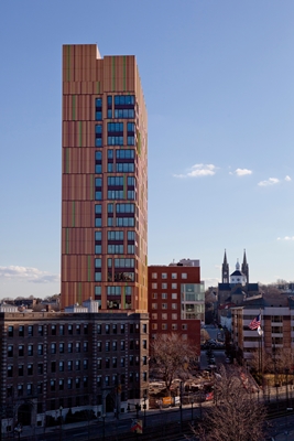 The Massachusetts College of Art and Design student residence is a modern interpretation of Viennese Art Nouveau. Gustav Klimt’s 1909 painting “The Tree of Life” inspired designers when planning the exterior of the building. Students, faculty members as well as alumni participated in the design process. In the words of B.K. Boley from ADD Inc. architectural office, “’The Tree of Life’ is stonepresent in almost every culture or art form in the world, it conveys change and optimism. The students wanted the building to read like a painting soaring in the sky - expressive and powerful. They felt it ought to embody the College of Art. The object was to include and represent the topic of sustainability in the building design. There is nothing more organic than a tree. By constructing this building, we have planted a thriving tree on the so-called Avenue of the Arts.” The architect comments on the work of Viennese artist Gustav Klimt saying, “His works embrace pointillism. Contrasting colours are juxtaposed and the overall effect is opulent in so many respects.” The tower’s vast façade surface is divided into rectangular shapes. A typical characteristic of Viennese Art Nouveau is breaking up large rigid surfaces. The whole complex has nonetheless a modern spin, since the characteristic flourishes and ornaments have been omitted. The material selection is modern, too. The ALUCOBOND® panels used for the façade cladding comprise seven shades and gloss levels ranging from 10% to 50%. Tamara Roy, also an architect at ADD Inc. says, “We began with darker colours at base level, lightening in tone as we moved upwards so that the building seems to disappear in the haze. The colour palette ranges from gold to rust and is reminiscent of tree bark. The green areas symbolize leaves. Finally, the base is bent - like a tree trunk, whose crown then extends outwards. The unevenness of the bark is recreated by using tray panels in different depths.”