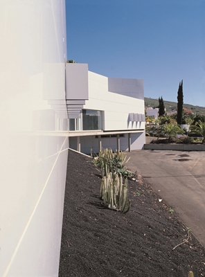 The medical centre designed by gpy architects stands at the outskirts of the Canary Island town of Arona. It forms a threshold between town and countryside, between mountains and valley, and the building’s two very different sides are in response to climate, access and function. The building’s well-designed floor plan and façades mediate between these contrasts. On the north side, the road level lies about one storey higher than on the south side. Entrance to the middle of the three storeys, where thereare public areas and examination rooms, is located here. This shaded entrance side opens up to the public thanks to an expansive glass frontage. In contrast, the south side faces the open countryside and its task is to offer a vista, shade and make an impact when viewed from the distance. The south façade can be changedfrom closed and monolithic to partially open by means of moveable window shutters according to weather conditions. Access to the lower ground floor, the approach road and garages for ambulances are located on the south side. The scale of the north side relates to the village of Arona, but on the east side, where the main road leads towards Arona, the architects have set an upper floor on top. This acts as a relaxation level for the employees, and the windows are obliquely recessed into the walls to give a measure of privacy from the exterior. The accentuated base, which balances out the topography of the slopes and provides a horizontal line for the façade construction, is typical in Arona. The architects have adopted this horizontality in the sloping terrain but use a grid of large format ALUCOBOND® tray panels all over the building and adapt all other different openings and graduated elements to suit it. The architecture is a unity and harmonises with the colours and scale of the village.