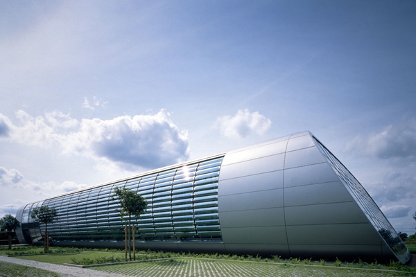 The design concept represents a revolutionary new building concept. The predominant features of the development are cylindrically shaped tubes, which lie parallel to one another. They are connected in the middle by a two-storey transverse link. Curved, laminated timber beams, spanning 20 metres,