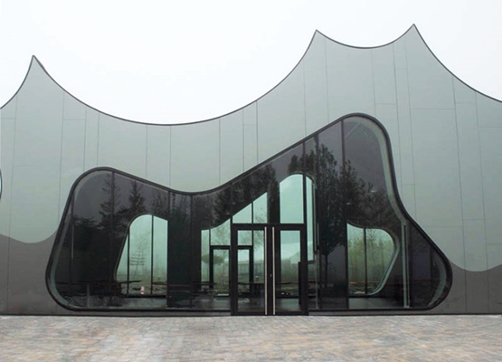 the park. The building endpoints make the boundaries between structures and parkland indistinct, and interior and exterior are linked by information areas and projection surfaces which relate to the theme of temporary exhibitions inside. The façade featuring a combination of ALUCOBOND® in