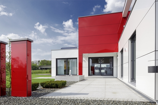 out onto a roof terrace. Seen from the exterior, the impressive architecture features two ingeniously entwined cuboids, perpetuated in the spatial colonnades which all but fade away into nothing. The sculptural nature of the building makes the contrast with the house’s functional interior particularly unexpected. The cuboid building’s façade used to be plastered in red and white, but was given a facelift with large format ALUCOBOND®panels in Sparkling Red and Spectra White Silver in 2013. Large windows and sliding elements exert great influence on the spatial ambiance by integrating the exterior environment into the architecture. The large granite-tiled roof-terrace is a great venue for lively parties or for relaxing on a lounger and gazing up at the stars. A way, lined with pillars, runs alongside