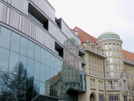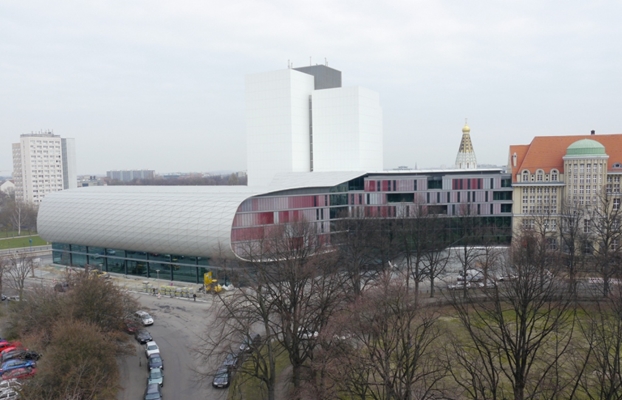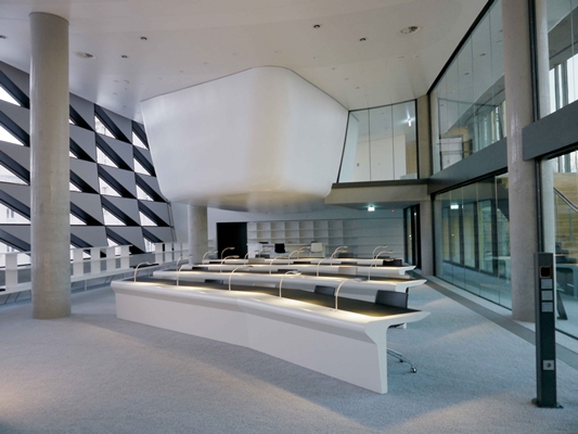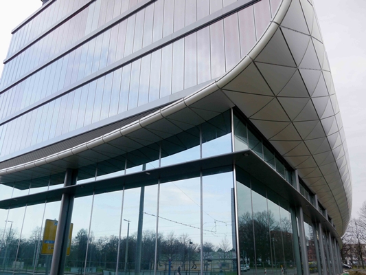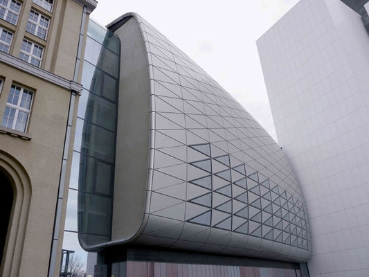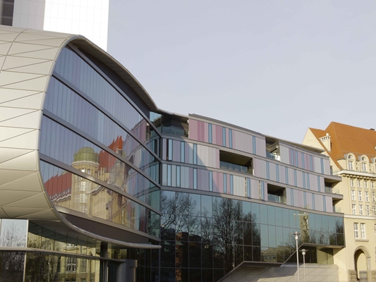 The fourth extension of the German National Library in Leipzig is bold and unconventional. According to the architect, Gabriele Glöckler: "The concept ‘envelope– cover – contents’ translates the function of the building into architecture. "Function creates form", is the architect’s motto. "The contents are protected by a compact cover around the repository area. A lighter envelope forms the exterior shell and connects the separate areas", she explains. "Allusion is made to both Leipzig’s musical tradition and the German Music Archives by using façade elements in graduated tones of red to interpret Bach’s Goldberg Variation number four." The first two annexes stretch out behind the façade of the German Library, built in 1912 by Oskar Pusch. In 1982, however, the GDR, set a dry, windowless complex consisting of five high towers slightly apart from the historic building. The new extension now closes this gap and links the neo-classical rectangular building, rendered less severe by Viennese art-nouveau nuances, with the book towers to form a whole entity. The new extension means the three very different building styles now interact with one another. An overall surface of 14.000 square meters now shelters the German Music Archive, previously in Berlin, and the German Book and Writing Museum. The enormous surface area is spread over nine floors, three of which were built underground. Back on the surface, the transparent extension is truly compelling. The ground floor serves as permanent or special exhibition space. Above the vitreous foyer the four main floors are clad with a silver envelope made of ALUCOBOND®.