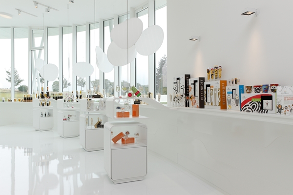 The design of the new showroom at the headquarters of Ritzenhoff AG was inspired by the shape of a hot drop of glass symbolizing the glassworks tradition of the company. The new showroom was not designed to compete with the classical modern administration building, but to stand as an independent, unobtrusive structure. The majority of the new building is set below the parkland, which follows the natural topography, only opening out onto the outside world through an amorphous glass façade. Even the parking areas disappear thanks to the clever use of different levels and the green paces with salient concrete elements. The visitor is led via white paths to the entrance area made of glass and