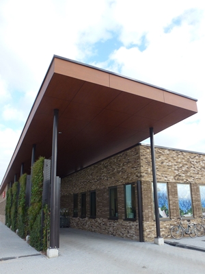 De enorme glazen gevel van de winkels zorgen voor een drempelloze overgang van de buiten- naar de binnenruimte en door de oplopende dakvorm met overkapping wordt de bezoeker al van verre ontvangen en kan in deze binnen-buiten ruimte de winkel betreden. Voor de naast gelegen bewoners van de appartementen is het dak tevens ontworpen als vijfde gevel en voorzien van sedum.