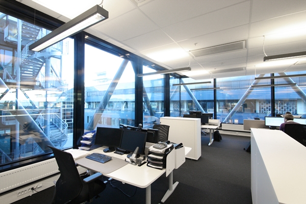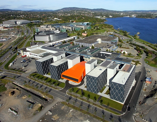 Flexible networks are a phenomenon of the last decade: networks consisting of a variety of people, who gather to work or live together for a short time and then drift apart again. The architects a-lab set about to create an office building which is flexible but with a unifying architectural identity on the former airport Fornebu, Oslo, for exactly this kind of user: IT people constantly in the process of changing and networking. The architects designed a network of independent structures linked by a semi-sunken base. The different uses and construction principles remain perceptible as does the significance of every individual building within the whole. The office accommodation is located in the four office wings, whose steel supporting construction is set in front of the façade like a net. The interior space can be divided into units that are variably separable, each with a surface of 3.750 m², spread over five storeys. Glass and anthracite coloured panels feature on the façade of the four office buildings and contrast with the four slender, windowless staircase towers between the tracts, which are completely clad in light grey stone. Light and dark alternate to form an organised row. The heart of the complex lies in its centre, an amorphous building with numerous rooms. It is the hub of the complex and its impact stems from its exterior mandarin orange ALUCOBOND® panels. A Network Orange, tells us about working together in the future.