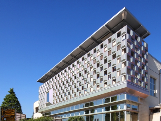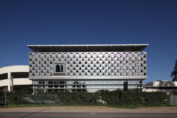 Milan experienced an economic boom in the 50s, attracting not only tourists but also Italians from other regions to the city. Numerous companies have been set up since the 50s and 60s. For instance, in Lainate just outside Milan, the printing ink factory Colograf, started producing in 1951. Nowadays, the founder‘s children manage the family company, and their success has meant that production premises have had to be extended. The architects Alessandra de Mico, Giacomo Rivolta and Salvatore Urso planned to locate the 6000 m², two-storey extension, containing production, logistics, laboratory and warehouse facilities, next to the old company. The really ingenious idea was making the façade overlooking the road and giving a face to the company‘s history. Adopting a 60s building style, they modelled the shell of the building to form a three-dimensional raster and emphasised this design with the Spectra colour Sakura. ALUCOBOND spectra® multi-tone colours vary even on flat surfaces depending on the angle of viewing and the three-dimensional shell makes this iridescence particularly evident. The building now takes effect as wrapped in glossy pale pink cellophane, gleaming like La Dolce Vita.