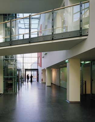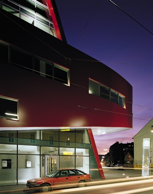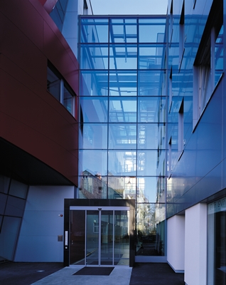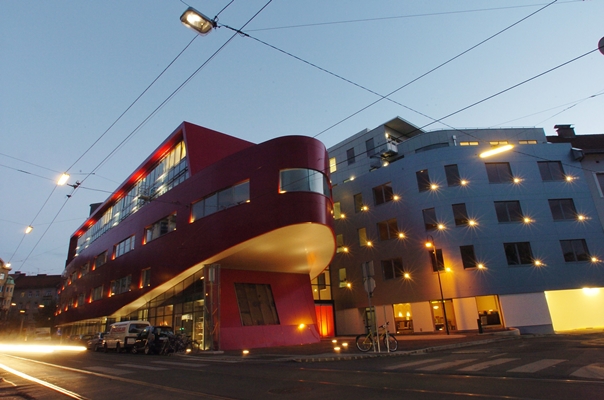 The commercial and event centre in Graz reaches its impact by form and colour. The building is affected by the street‘s course. The red part of the building is joint to the court‘s structure with bridges on every floor. The vertical exploitation of the building is granted through a central elevator and three staircases. Nine floors accommodate substantial functions, showing principles of Feng-Shui: the water basin and the cascade in the hall. Elements such as floating bridges and planted area-ways are an architectural specialty. In the three basement floors are the areas for parking, technics and storage.The ground floor is dominated by the central hall. Offices and a restaurant are placed in the red wing. Next to the courtyard is a big room for events as well as conference rooms. A connection between the different wings is created with fluent forms and the materiality. The envelope made in ALUCOBOND® in splendid red continues into the interior. The calming façades of the opposing wing are made in silvermetallic and blue grey metallic.