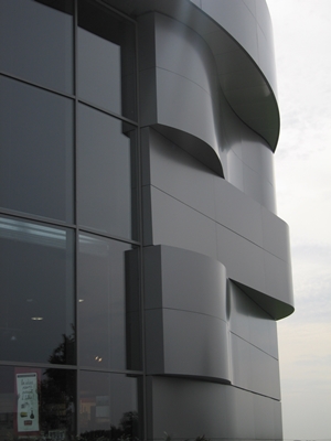 Waves in architecture symbolize a dynamic movement. The new commercial complex in Angoulins has its dynamic not only in the wavy form of the building, but on its façade as well. Situated near the atlantic coast the waves prefigure the movement of the sea. The fluid progression can be interpreted as well on the advancing development of the diverse enterprises in the complex, amongst them an indoor playing ground for children. The curved tray panels confer a particular vitality to the building.