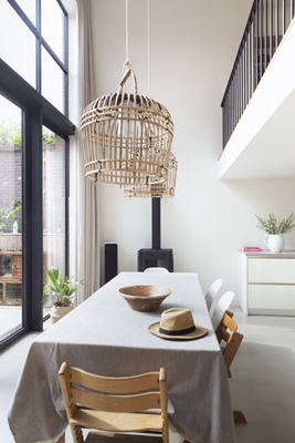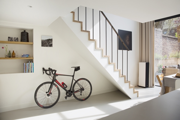 De riante dubbelhoge uitbouw werd ingezet om twee woonverdiepingen (woonkamer en keuken) met elkaar te verbinden tot één grote ruimte
