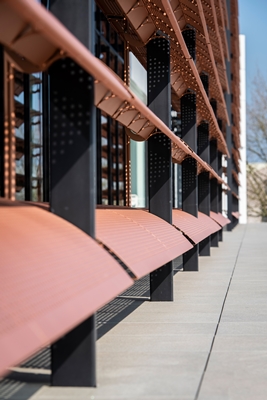 ‘Om te vermijden dat de zon in de zomer vijand wordt van het wooncomfort, is zonwering onmisbaar’, benadrukt Schellen. ‘Daarom de keuze voor de structurele lamellen DucoSun Wing. Uit ervaring met andere kantoren weten we dat we de lamellen op een zuidgevel best horizontaal plaatsen omdat de zon hoog staat. De architecturale meerwaarde van de lamellen op de riante zuidgevel is niet te onderschatten. Zowel financieel als technisch kwam Duco het best uit in de vergelijking. Denk maar aan de specifieke vorm en de ophanging van de lamellen. Samen hebben we gezocht naar de ideale warme kleur.’ Beweegbaar systeem ‘De DucoSun Wing is geperforeerd en zorgt zo voor een perfecte harmonie tussen zonwering en beschaduwing’, vertelt Pieter Decat, technisch-commercieel adviseur. ‘Het vleugelvormige lamel heeft een urban design en kan met de zon meedraaien, waardoor de inval van het licht gestuurd kan worden. Dit biedt de mogelijkheid voor meer sfeer in de ruimte. De stand van de lamellen kan vrijwel traploos geregeld worden, zodat op de werkvloer, hoe de zon ook naar binnen schijnt, er geen last is van hinderlijke lichtinval. De structurele zonwering bij DCM zorgt niet alleen voor een efficiënte afscherming van de zonnestralen, ze garandeert ook een daling van de gemiddelde temperatuur binnenshuis tot 12% in de strijd tegen oververhitting’. ‘Met als eindresultaat een nieuwbouwkantoor waar we terecht trots op mogen zijn’, voegt Schellen er aan toe.