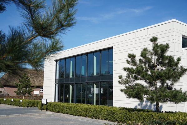Herrijzen als een feniks uit zijn eigen as. Na een uitslaande brand is het bedrijf nagenoeg opnieuw begonnen. Door middel van onze kennis in bedrijfsprocessen hebben we met de opdrachtgever een optimale invulling gevonden voor product handeling enerzijds en brandcompartimentering van het bedrijf anderzijds. Het ontwerp bestaat uit een samenvoeging van het verleden en heden. Het door de brand gespaarde bedrijfsdeel is geïntegreerd in het nieuwe ontwerp en een overgang van schuin naar recht is geïntroduceerd. Het nieuwe bedrijf kenmerkt zich in strakke herkenbare vormen. Het kantoor is eenvoudig van vorm maar krachtig in zijn expressie. Witte wanden en de grote openingen, die diep in de gevel zijn geplaatst, geven het idee van een doos in een doos.