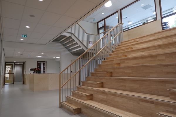 De centrale hal is het bruisende hart van de school. Een keuken met uitgiftepunt, de tribunetrap, een piano, leestafels en de mediatheek maken van het hart een levendig centrum. De hal kan gekoppeld worden aan het speellokaal. Hierdoor ontstaat één grote ruimte voor voorstellingen en optredens.
