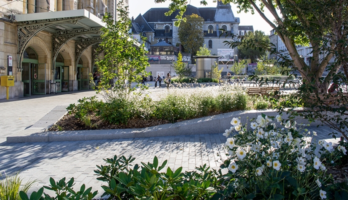 Met een reeks dichtbeplante tuinen, geïnspireerd op het lokale impressionisme, vermindert het project kunstmatige oppervlakken en vergroot het de biodiversiteit van het gebied met een breed scala aan vaste planten en boomsoorten. In combinatie met het gebruik van lichtkleurige natuursteen verbetert het ontwerp het microklimaat van het gebied aanzienlijk, waardoor de lokale temperatuur mogelijk met 4° wordt verlaagd.