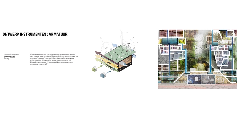 De huidige barrières van de waterlinieweg en de A27 worden de basis die de centra van toekomstig Utrecht verbinden. De 2-dimensionaal georganiseerde functies, zoals wegen en wonen, zullen veranderen in een 3-dimensionale stad. Dit productief en eindeloos verbonden landschap, de gelaagde stad, zal de hoogte en diepte ingaan waarbij nieuwe urban strata worden verweven met huidige en historische lagen. In dit landschap vullen de functies elkaar aan en wordt alles geoptimaliseerd in ruimte en in tijd om zo een circulaire stad te creëren. In deze gelaagde stad heeft alles, inclusief afval, zijn opbrengst en alles wordt ontworpen voor een bepaalde tijd.