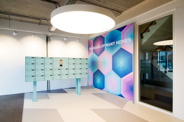 In de gemeenschappelijke ruimtes zoals de entree, het café, de wasruimte en de gangen ligt een mooie combinatie van kleuren uit de Marmoleum Concrete collectie.