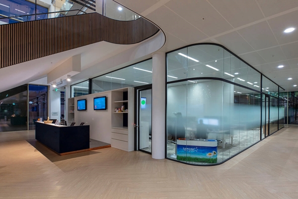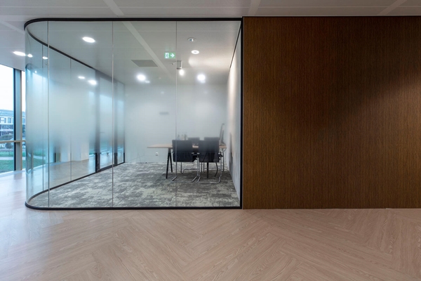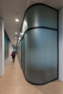 Om de uitstraling van het pand te verzachten, zijn de hoeken van het gebouw afgerond. Deze rondingen komen terug in het interieur middels de speciaal ontwikkelde Clearvision 60 systeemwanden met ronde glashoeken. Op de begane grond zijn de wanden voorzien van een deellijn en zijn ze maar liefst 3.80 meter hoog!