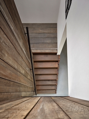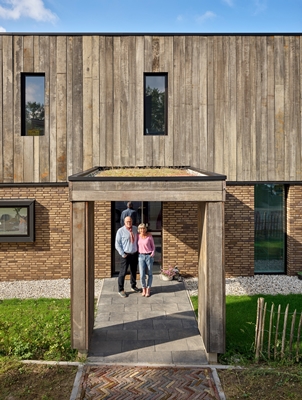 Maar ook in het bouwkundig ontwerp is duurzaamheid leidend geweest. Zowel voor de ruimtelijke organisatie, als voor de detaillering. Zo is het huis rondom zeer goed geïsoleerd (RC rondom van 7 m²K/W). De daken zijn voorzien van vegetatiedaken. Ook zijn er geavanceerde op afstand bediende buitenzonweringen aangebracht, en zorgen daklichten voor daglicht op de donkerste plekken. In de dubbelhoge woonkamer schijnt de hele dag daglicht ondanks de noordelijke ligging dankzij hoge ramen op het oosten en het westen. Een overstek aan de zuidgevel voorziet de woonkeuken van schaduw in de zomer. De expressieve houten gevels zijn gemaakt van 60 jaar oude herbruik Azobé beschoeiingen. Het patroon van wisselende breedten en het prachtige patina van de gevel geven het huis een even stoer als aanraakbaar karakter.