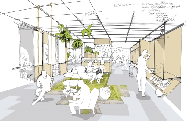Geïnspireerd op Knabs ambities voor verandering en innovatie in het bankwezen, zijn de stigma’s van het bank interieur tegen het licht gehouden. In tegenstelling tot een enigszins voorspelbaar, steriel en zakelijk ontwerp is er voor gekozen om het kantoor te benaderen als een eigentijds clubhuis van het internetbankieren, waarin de kernwaarden van Knab - openheid, positiviteit, betrokkenheid en ondernemend- vertaald zijn in een ruimtelijk ontwerp voor medewerkers én bezoekers. Er is geprobeerd om een plek te ontwerpen waar mensen vrijuit samen kunnen werken en kunnen ontmoeten op diverse plekken die open en ondersteunend zijn aan de dagelijkse activiteiten van de ‘Club’.