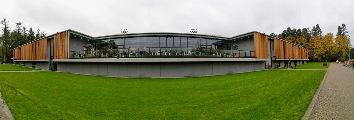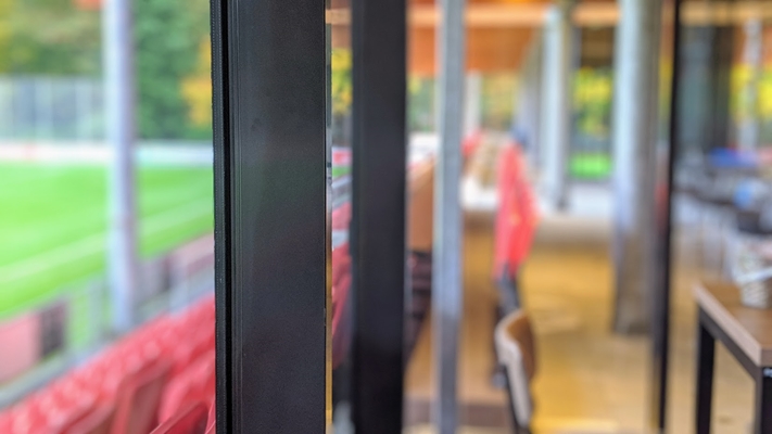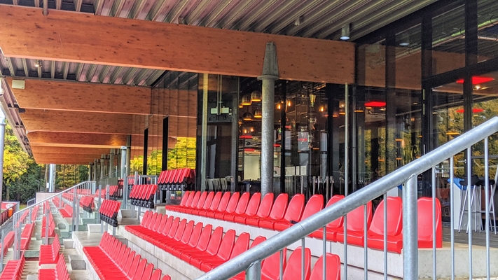 De lange glazen pui van De Herdgang zorgt voor deze prachtig transparante uitstraling. Naast transparantie haalt de Eindhovense club hiermee ook de bosrijke omgeving naar binnen.