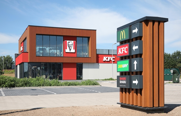 Gevels restaurants in Foodcourt: aluminium profielen mét houtlook