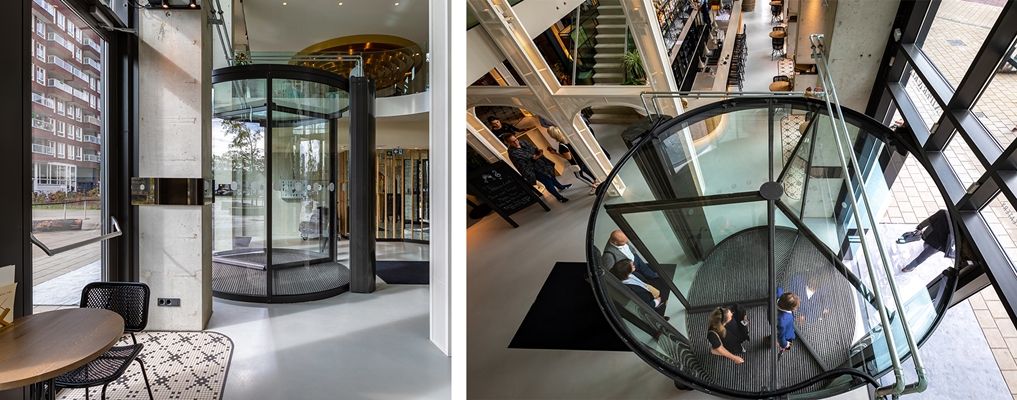 als hoofdentree ook aan bij. Deze tourniquetdeur met glazen plafond zorgt voor een constante scheiding tussen het buiten- en binnenklimaat.