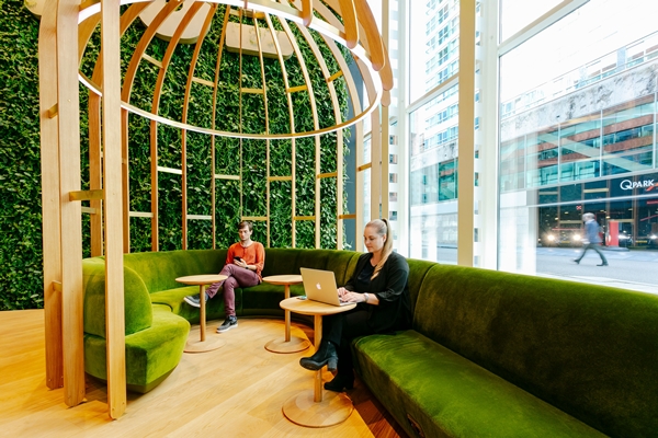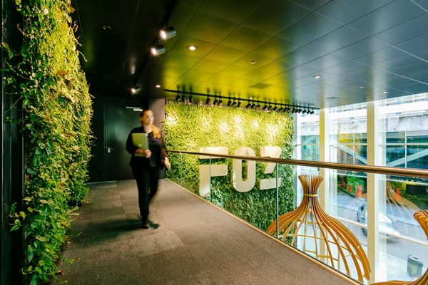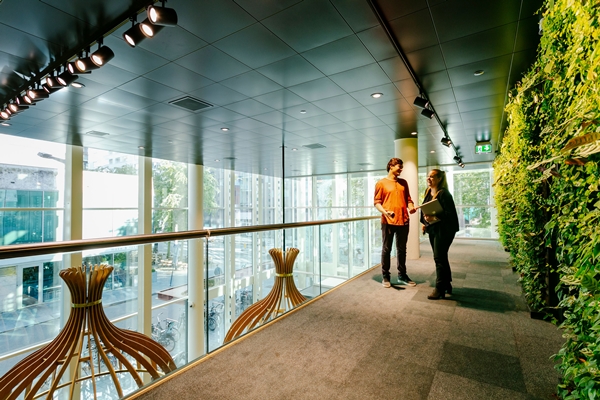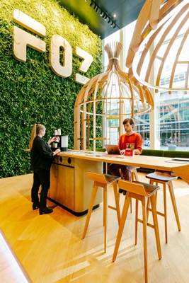 Op de drukke Zuidas, het zakendistrict in Amsterdam, is het FOZ Building een felbegeerd en exclusief kantoorgebouw. De entree van dit kantoorpand is een imposante ruimte met plafonds van 7 meter hoog. Het ontbrak echter aan een gastvrije en warme sfeer om zaken te doen onder het genot van een kop koffie, of voor informele meetings tussen collega's. In opdracht van Patrizia transformeerde architect D/Dock de kille ruimte tot een groene oase met een uitnodigende uitstraling door weelderig groene gevels en houten elementen toe te passen.