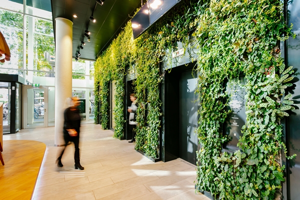 is in een anders luidruchtige entree een groene oase ontstaan. De groene gevels zijn niet alleen mooi, ze absorberen omgevingsgeluid en hebben een bewezen positief effect op het welzijn van mensen. Voor de beplanting is gekozen voor drie plantensoorten: als basis is de Philodendron scandens (70%) gebruikt, waarbij de Marantha (15%) en Ficus repens (15%) voor kleuraccenten zorgen.