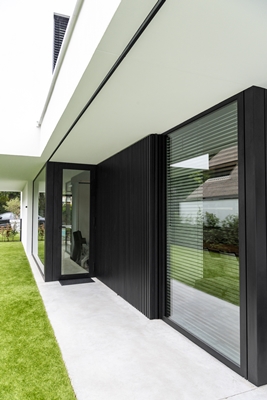 Luxe, stijl en degelijkheid: dat zijn de kernbegrippen in dit project. Dankzij de verticale plaatsing van het aluminium, creëerden we een strak lijnenspel in het interieur. De voordeur werd ingewerkt zodat het opgaat in het geheel - met een strakke en minimalistische uitstraling als resultaat.