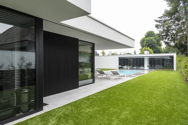 . Om de stijl van de villa door te trekken, werd ook hier Mato 1 gebruikt. Op die manier vormen de villa en het achterhuis, met tussenin het zwembad, een mooi geheel. PS: wist je dat zelfs de hond een eigen zwembad kreeg?