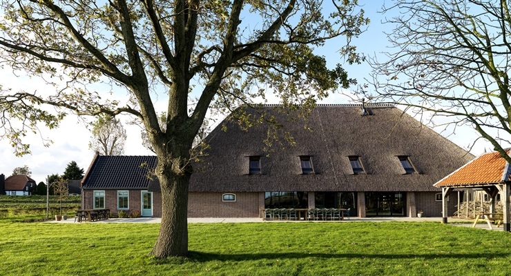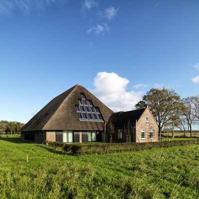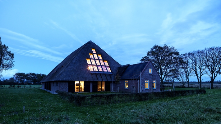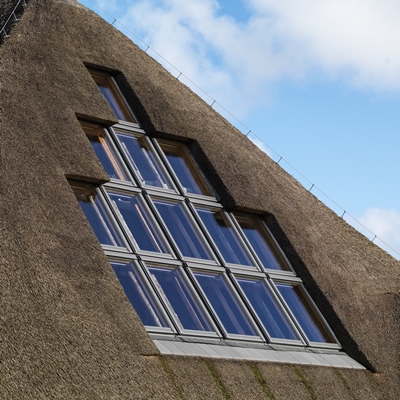 Voor het exterieur werd een zeer opvallende oplossing bedacht. “Aan de hand van geschakelde VELUX vensters hebben we een equivalent gemaakt van een getrapte dakspiegel. Stolpboerderijen staan bekend om een met pannen bedekt uitgespaard gedeelte in het rieten dakvlak. Die pannen hebben we eigenlijk vervangen voor