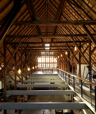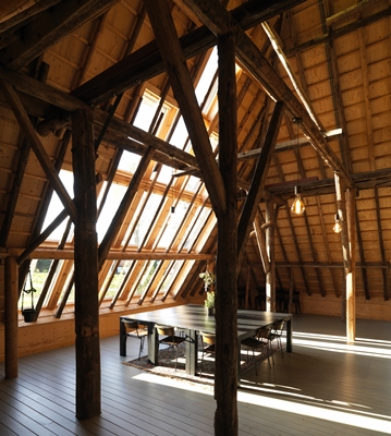 in de noordoostgevel en 14 in de zuidwestgevel in een bijzondere opzet zorgen ervoor dat deze historische houten constructie op schitterende wijze voor het voetlicht wordt gebracht en dat de schuur overgoten is met daglicht.