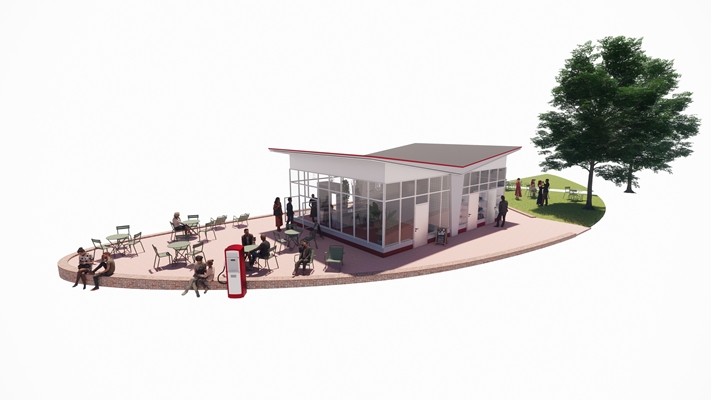 In ons ontwerp opent het Dudokgebouw zich weer naar de pleinzijde. Een uitgifteraam biedt koffie, thee en kleine versnaperingen. Er is geen vast commercieel terras; je kan overal op het plein gaan zitten met je drankje. Aan de teruggeplaatste Dudok-pomp laad je ondertussen even je elektrische fiets op.De bestaande overtuin aan de achterzijde van het Dudokgebouw wordt nadrukkelijk betrokken in de vormentaal van het pleinontwerp. Hierdoor ontstaat daar een klein podium, en kunnen mensen op de LED-schermen van de transformatorruimte genieten van digitale kunstwerken of films. Zo heeft het Dudokgebouw twee voorkanten gekregen.